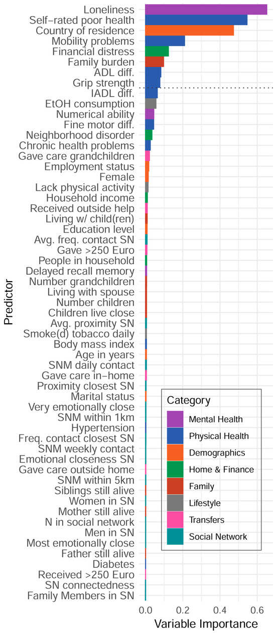 RFML parameter tuning results showed diminishing returns (reductions in mean absolute error < 0.001) beyond ntree = 300 and mtry = 11, so those parameter values were selected for the RFML test run. The results from the latter (variable importance rankings) are shown in Figure 2. The top predictors were loneliness, self-reported poor health, and country of residence. Additional predictors of note were related to functional health (mobility problems, difficulties in ADL, and grip strength), financial distress, family care burden, frequency of alcohol consumption, numerical ability, and neighborhood disorder.