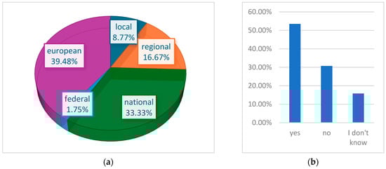 Another area of interest for our study was online public consultations and elections, and so students were asked to name the level they considered most desirable for online public consultations, choosing between the local, regional, national, federal, and European levels (Figure 3a). They were also asked whether online elections should be held at all these levels in the near future (Figure 3b). The results show that 39.5% of respondents consider the European level to be the most desirable one, while 34.3% consider the national level to be the most desirable. Only 1.9% mentioned the federal level. An explanation for the results regarding the federal level could be the fact that, in Romania (respondents’ country of origin), the highest level of administrative organization is the national level. Regarding the organization of online elections at all levels in the European Union, 53.5% of respondents agreed with this option, while 30.7% disagreed, and 15.8% said they did not know.