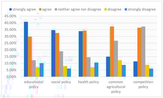 A large number of respondents felt that education policy, social policy, and health policy are public policy areas that should be subject to mandatory public debate and online consultation, to the detriment of competition policy, common agricultural policy, environmental policy, transport policy, and cultural policy (Figure 4). Thus, out of 228 respondents, 161 (70.6%) indicated that they support online debates in the field of education policy, choosing the two response options “strongly agree” and “agree”.
