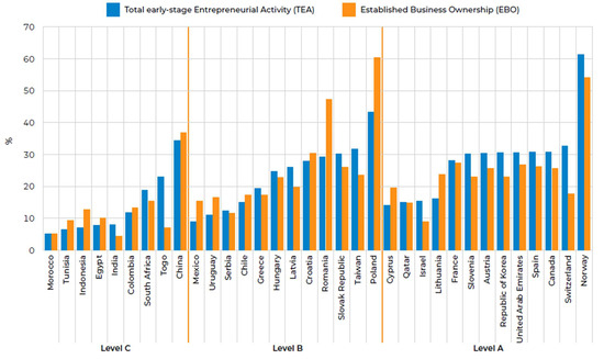 Figure 1 compares the levels of Total Early-Stage Entrepreneurial Activity (TEA) between the 18–34 and 35–64 age groups, highlighting a higher percentage of young adults (18–34) involved in entrepreneurial ventures.