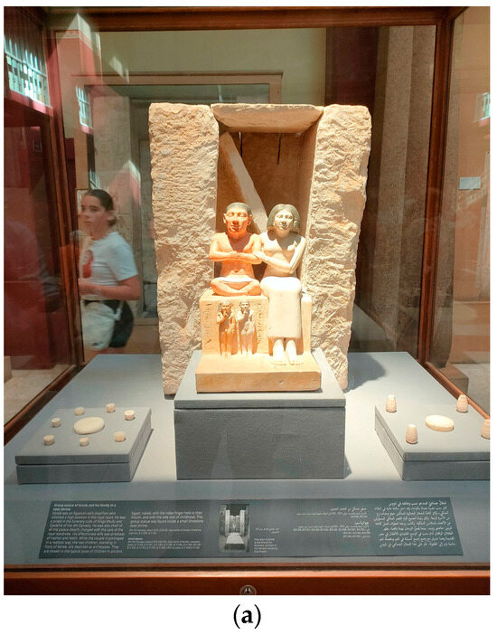 (a): Showcase featuring the group statue of Seneb, a high-ranking priest with dwarfism, depicted alongside his average-sized wife, their two children, and funerary items from his tomb, the Old Kingdom, EMC. (Photo by author). (b): Close-up view of Seneb and his wife, highlighting the detailed craftsmanship. (Photo by author).