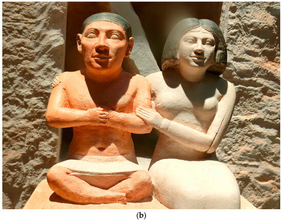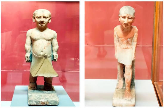 The extensive collection of iconographic and textual resources, still preserved today, presents an exceptional and significant opportunity to explore ancient Egyptian society’s perception of disability. The depictions of disabled individuals with various impairments and mythological figures, such as those with dwarfism were prevalent in the tombs’ wall paintings, artifacts, and other sculptures as part of everyday life (Figure 1a,b and Figure 2), indicating the diverse and inclusive nature of ancient Egyptian society (Dasen 2013; Dawson 1938; Mahran and Mostafa Kamal 2016; Nunn 1996). The inclusion of disabled people in different work domains and professions, whether in religious or public services, was documented in Egyptian art, tombs, wall paintings, and textual records (David 2016, pp. 83–84).
