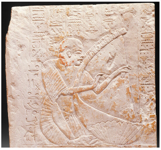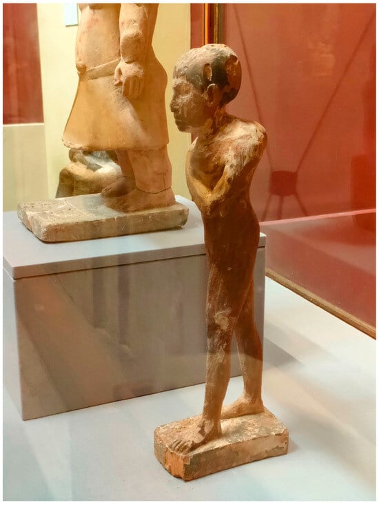 Throughout history, many civilizations have associated physical beauty and perfect bodies with divine approval and regarded physical deformities as signs of divine disfavor (David 2016, p. 84; Sullivan 2001). In contrast to this view, ancient Egyptian society demonstrated cultural acceptance of physical disabilities, with some disabilities being viewed as divine blessings. Rather than being stigmatized, disability was represented in ancient Egyptian art as a natural part of human differences (Zakrzewski 2014, pp. 64–65) (Figure 4 and Figure 5).