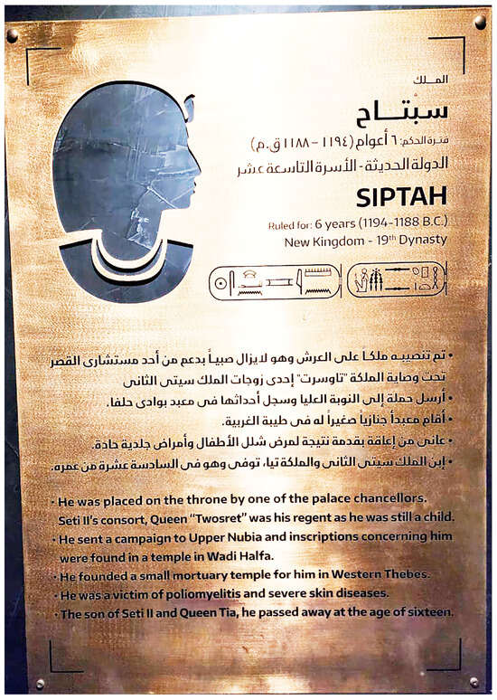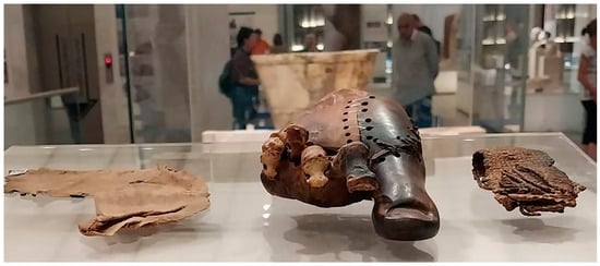 NMEC displays the mummy of King Siptah in its mummy gallery. Siptah, an Egyptian ruler from the 19th Dynasty, had a physical disability in his left foot, believed by some Egyptologists to be caused by poliomyelitis, cerebral palsy, or a club foot developed during his childhood (Hawass 2021, pp. 108–10; Ikram 1998; Morris 2022) (see Figure 8). One of the NMEC’s curators remarked the following: “Among the Egyptian mummies in the mummy gallery is the mummy of King Siptah, who had a disability; he suffered from polio”. Another curator shared their experience: “I participated in preparing a showcase in the core gallery for a prosthesis for an Egyptian lady who was disabled” (see Figure 6). A third commented, “I guess we have some artifacts relevant to disability, but they are from other historical periods”.