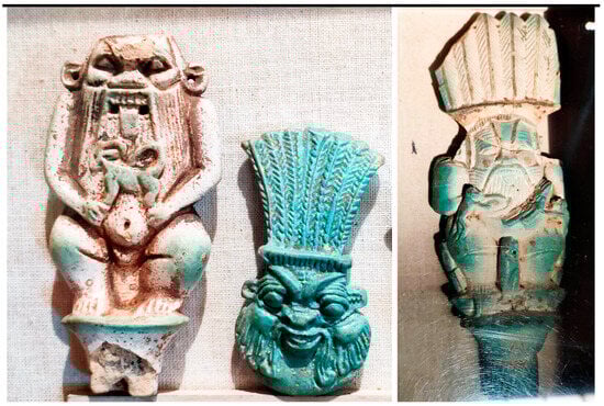 Undoubtedly, the distinct religious beliefs of the ancient Egyptians shaped their perception of disability and body deformities, particularly the Osirian mythology, which promoted the worship of a physically damaged god who nevertheless attained eternal perfection (David 2016, p. 86). Within the Egyptian pantheon, many gods had non-normative attributes, including deities with dwarfs, such as Bes, Beset, Ptah/Pataikos, and other gods with deformed bodies, such as Hapi (Dawson 1938; Sullivan 2001) (Figure 7). Further, some scholars argue that ancient Egyptians portrayed their Ptolemaic-Egyptian God Harpocrates as having cerebral palsy in their artwork: amulets and statues (Morris 2022, pp. 145–204; 2023). These physical characteristics of bodily differences were often seen as a positive mark of divine blessings with religious significance, leading to the care and respect for the disabled.