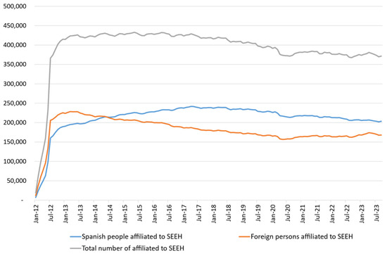 Regarding the profile of people employed in this sector, the presence of foreign people stands out in absolute number and percentage terms concerning the total number of affiliates, representing more than 55% of all affiliations in July 2012 (Figure 1). In general, and despite not making up half of the members in this sector, the proportion of foreign people is close to half of the memberships (Figure 1). This profile is even more definable based on the gender of the affiliates since, in 2023, more than 90% of the people affiliated with this regime were women, reflecting the feminization of said professions and tasks.