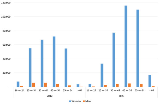 Total Social Security affiliates in the Special System for Household Employees, by age, 2012 and 2023. Source: Prepared by the authors based on data from the Affiliation of Workers to the Social Security System (Ministry of Inclusion, Social Security and Migration).