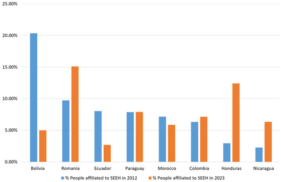 If we consider the leading countries of the nationality of the people affiliated with the SEEH, we observe that in 2012, the three top countries were Bolivia, Romania, and Ecuador (Figure 3). On the other hand, in 2023, the leading countries for foreign domestic workers are Romania, Honduras, and Paraguay.