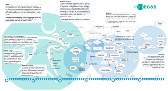 Figure 1 shows a map for a single family in the years before school entry. Interestingly, this example was selected because the mother, despite the complexity of interactions and the evident ableism in the childcare system, told us that their experience was the “best case scenario”.