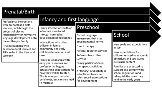 Even before children are born, families are given messages about their children’s development through prenatal directives about mother’s behaviours, in utero screening processes, and information about parenting norms. These messages are internalized early, and this institutional discourse becomes part of how families describe their children. For example, some families had contact with speech-language pathologists as early as infancy, particularly when the child was diagnosed pre-term or at birth with characteristics that might affect their communication or language. Families report that screening for developmental delays also begins early and continues throughout the early years.