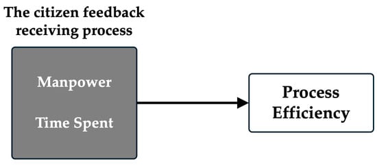 To evaluate the process efficiency, the workflow is analyzed in detail, considering the time spent at each step and the number of personnel involved. The current workflow requires nine personnel and takes a minimum of 1965 min, or approximately 32.75 h, to complete. The efficiency of this process, calculated using Equation (1), is 0.00339 transactions per manpower-hour. In other words, each hour of manpower, with one person working for one hour, results in 0.00339 completed transactions of the entire process. This includes every procedure from collecting citizen feedback to providing a response. To put it more clearly, it takes about 295 manpower-hours, which is equivalent to nine people working for 32.75 h, to complete one full transaction. This value is used as a baseline for comparison with a digital-by-design workflow.