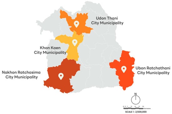 The research areas selected for this study are the municipalities of four major cities in the Northeastern region of Thailand: Khon Kaen, Nakhon Ratchasima, Udon Thani, and Ubon Ratchathani, as illustrated in Figure 2. These municipalities were chosen based on their status as large urban centers with significant populations and relatively high levels of internet penetration, which reflect their advanced technological readiness. Such characteristics make them ideal case studies for evaluating the feasibility and potential impact of implementing SLTs in LAOs.