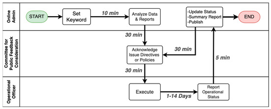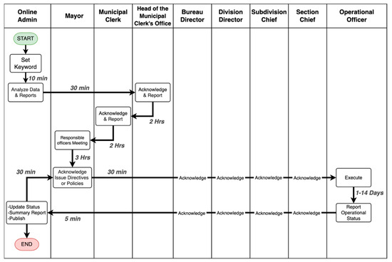 When the four municipalities implemented the SLTs to gather citizen feedback, the response process exhibited similarities. The process involved nine key persons: Online Admin, Mayor, Municipal Clerk, Head of the Municipal Clerk’s Office, Bureau Director, Division Director, Subdivision Chief, Section Chief, and Operational Officer. The entire sequence of activities, from the initial receipt of citizen feedback to the final resolution and reporting, is illustrated in a swimlane diagram in Figure 3.