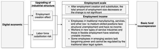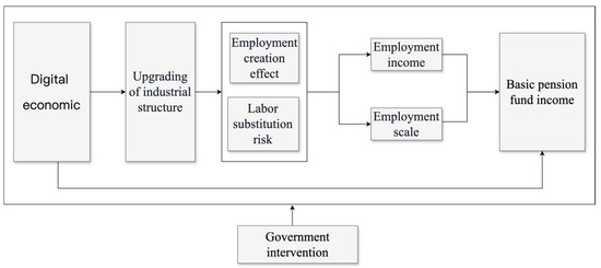 In this paper, the impact of the digital economy development on the income of the pension insurance fund for urban employees, as well as the roles of advanced industrial structure, employment scale, and government intervention are analyzed. The findings support two proposed hypotheses. Firstly, the digital economy development has had a significant negative effect on the pension insurance fund for urban employees. And the high advancement of industrial structure plays a partial mediating role in the relationship between the digital economy development and pension fund income. Due to the widespread application of digital technology, the industrial structure is developing in the direction of high technology, which affects the proportion of the population contributing and the average social wage, thereby exerting a negative influence on the fund income. Secondly, government intervention plays a significant moderating role between the digital economy development and basic pension insurance fund income. The suggestion in this paper is that the appropriate government intervention is essential to alleviate the negative impact of the digital economy. Therefore, the government should pay attention to balancing the relationship between the digital economy development and pension fund income when establishing the related policy. Unlike the findings of previous research, this study did not identify the employment scale as a mediator in the relationship between the digital economy development and pension fund income. That is probably because digital technologies cause lots of the traditional jobs to disappear, but play an increasingly important role in creating new job opportunities, resulting in little change in the overall employment scale.