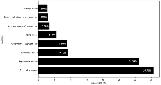 As illustrated in the feature importance chart shown in Figure 3, it is evident that the importance of the characteristic “digital economy” reaches as high as 35.70%, indicating that the rapid development of the digital economy is a key factor influencing the income of pension insurance funds. The importance of the features “employment scale” and “high advancement of industrial structure” is 31.20% and 3.00%, respectively, and they also have effects on the income of pension insurance funds. The high advancement of the industrial structure reflects the overall level of economic development of a region. A higher level of advancement usually indicates a larger proportion of the tertiary industry in the industrial structure and a higher per capita income, which directly drive the increase in contributors and the contribution base, potentially facilitating an increase in the income of the basic pension funds. The scale of employment also has a direct impact on the number of insured contributors. The larger the employed population, the larger the payment group, and the greater the impact on the fund income. The importance of “government intervention” is 8.90%, indicating that the regulatory role of government policies cannot be overlooked. In contrast, the importance of “ageing rate” is only 5.70%, suggesting that its direct impact on the fund returns is relatively limited. Other factors, such as years of education and average wage levels, also have a comparatively minor yet non-negligible impact on the fund income.