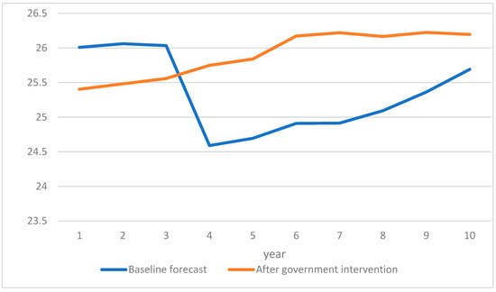 Furthermore, by comparing the prediction results of the two groups, as shown in Table 11 and Figure 4, it can be observed that following government intervention, the projected income for the pension fund has increased. This aligns with our expectations that government intervention can somewhat mitigate the adverse effects of digital economic development on the pension fund income (as illustrated in the chart below using Beijing as a case). The results of the prediction demonstrate a clear decline in the basic pension insurance fund income for urban employees over time. However, with the introduction of government intervention, the projected income for this pension fund has risen. This suggests that by improving the social security system and optimizing the corresponding policy system, the government can alleviate the unfavorable effect of digital economic growth on the pension fund income to a certain extent.