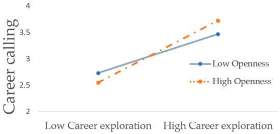 As shown in Table 7, the interaction term of career exploration × openness in model 2 (B = 0.110, SE = 0.036) significantly and positively predicts career calling. This provides preliminary support for 5. To further explore the moderating effect of openness, a graphical analysis was conducted, and the results are presented in Figure 2.
