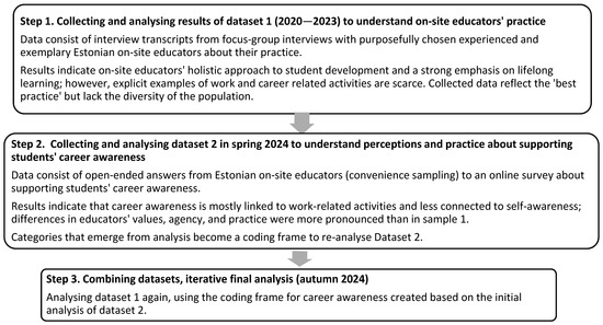 We designed our study in three steps (see Figure 1). In the first step, we explored the practice of experienced and distinguished on-site educators from very different organisation types, sizes, and geographical regions of Estonia. Purposeful sampling enabled us to study information-rich cases and collect rich data (Emmel 2013) to understand the practice of skilful on-site educators and the organisations where they work. In the second step, we aimed for maximum variation (Emmel 2013) to illuminate the perceptions and practice of on-site educators concerning supporting career awareness by all members of the community of practice. In the third step, we analysed the results iteratively. Qualitative content analysis was used to find meaningful patterns from the data, flexibly combine different datasets, and reduce data (Schreier 2013).