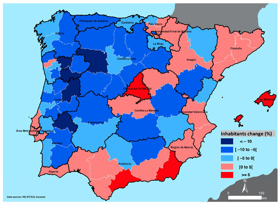 Variation of resident population (2011–2021). Source: Own elaboration, based on data from INE (Portugal and Spain).