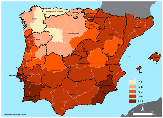 Birth rate (2021). Source: Own elaboration, based on data from INE (Portugal and Spain).
