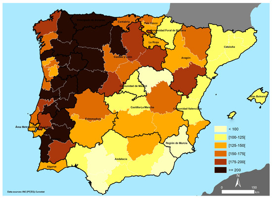 These social and demographic dynamics are reflected in a progressive alteration of the resident population profile in both countries, particularly in border areas (Figure 2 and Figure 3). Indeed, there is a continuous decrease in birth rate, with the lowest values recorded on the Spanish border with the northern region of Portugal. This process is linked to a dynamic of zero or negative natural growth in several regions, with the effects mitigated by a positive migratory dynamic, capable of attracting and settling new residents, often originating from Portuguese and Spanish-speaking countries, as well as from Africa or Eastern Europe. Despite this, aging is increasing at an increasingly intense pace, with territorial diversity (particularly relevant in border areas) and associated with a vicious circle of low density (Chamusca et al. 2022), leading to aging (Figure 4), a decrease in human capital, both public and private investment, and an increase in economic and social asymmetries.