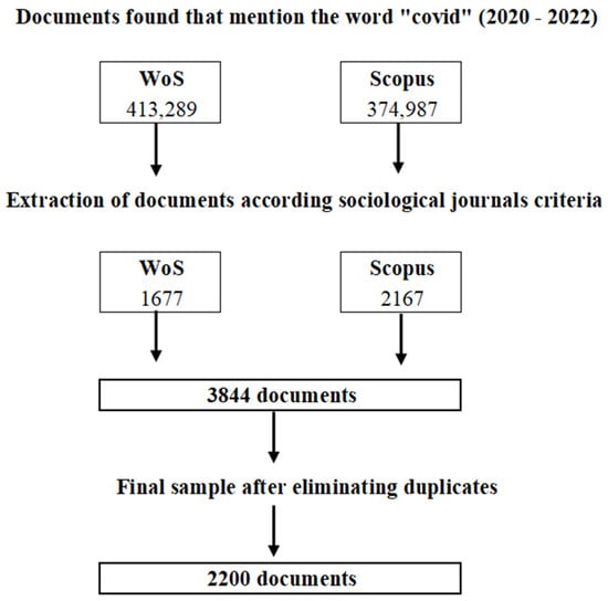 In a subsequent phase, a rigorous selection of documents was carried out, limiting the scope exclusively to publications within the field of sociology. This operation resulted in the identification of a total of 1677 documents in the Web of Science (WoS) database and 2167 documents in Scopus. Afterwards, a meticulous process of cleaning and preparation of both databases was undertaken for their integration, culminating in the creation of a unified database upon which the relevant analyses will be conducted. To determine the final number of documents included in our study universe, all publications with duplicate DOIs were eliminated, and a thorough review of authors, titles, and publication journals was conducted to identify potential duplicate articles without DOIs. As a result of this process, a total of 2200 documents were counted as an integral part of our study. The document selection procedure is detailed in Figure 1.
