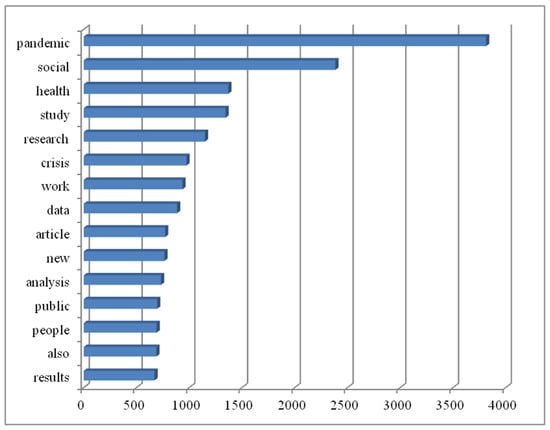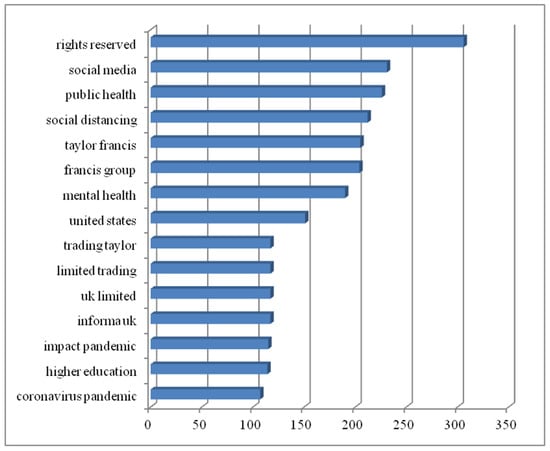 For the removal of stopwords and the performance of tokenization (see Section 3.3), the natural language toolkit (NLTK) library was used. Additionally, the word “covid” was specifically excluded from the corpus, given its use in the study’s search criteria. The most frequent terms and phrases identified in the document set are presented in Figure 2 and Figure 3, providing a quantitative view of lexical prevalence in the analyzed corpus.
