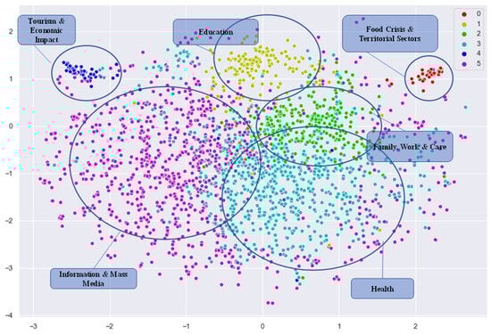 The primary objective set forth in this study was to identify the main topics investigated in the sociological discipline regarding the health crisis caused by COVID-19. Through the use of natural language processing (NLP) techniques and the application of the textual analysis algorithms mentioned in Section 3, we were able to identify six major groups of general themes established as follows: 1. information and mass media, 2. health, 3. family, work, and care, 4. education, 5. tourism and economic effect, and finally, 6. food crisis and territorial systems.