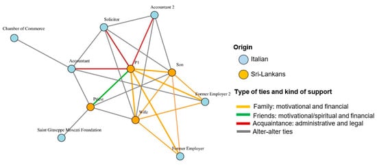 Some descriptive statistics of the network confirmed the behaviour of P1 in pursuing his business project. This network consisted of 13 nodes and 56 ties (size) and illustrated the active role of the close-knit network. The E-I index4 values for the formal–informal and out–in partitions explained this result. The first partition included all relationships established with the institution and local stakeholders (formal) and those within the close-knit network (informal). The second partition involved all the relationships that referred to the ethnic group (in) and externally with the locals (out). The homophily values (E-I index) confirmed that P1 realised his entrepreneurial project by leveraging his informal relationships (−0.571) and connections outside the Sri Lankan community (0.429).