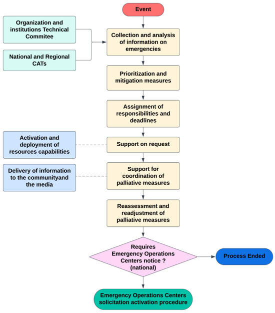 In order to understand how the decision-making system works in case of an event, the structure of this process is detailed. At a local level, Emergency Operations Centers (COEs) are established at the national, municipal, and local levels. Their primary objective is to address potential emergencies, ongoing emergencies, or emergencies already occurring. The purpose is to establish and coordinate mitigation actions while providing support to regional decision-making. The technical tables follow the process outlined in Figure 1 (ONEMI—Ministerio del Interior y Seguridad Pública 2017):