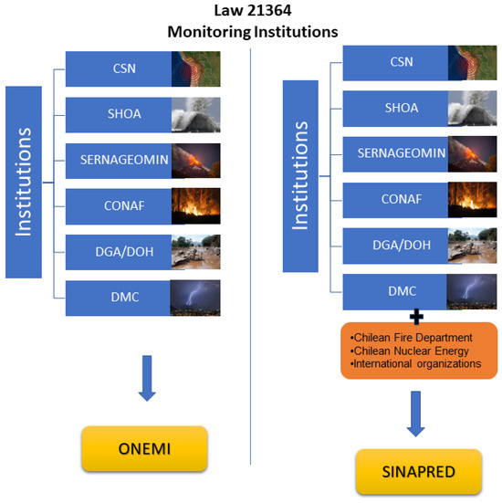 Previous and current early warning structure; SERNAGEOMIN: The National Service of Geology and Mining; CONAF: The National Forestry Corporation; SHOA: The Hydrographic and Oceanographic Service of the Chilean Navy; CSN: The National Seismological Centre; DGA/DOH: General Water Directorate/Directorate of Hydraulic Projects; DMC: Meteorological Directorate of Chile.