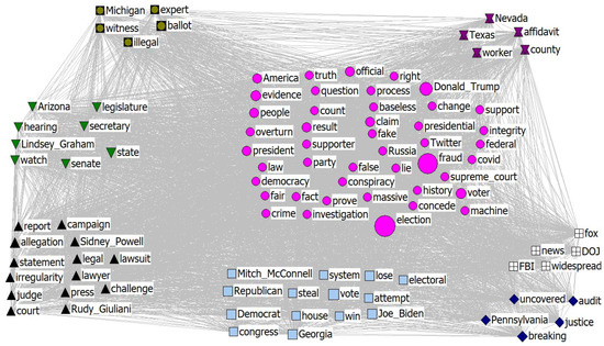 CONvergence of iterated CORrelation (CONCOR) networks of unsubstantiated claims of presidential election fraud in the United States. Note: the size of the concentric circles indicates the degree centrality among words. The thicker the line, the greater the number of links it represents.