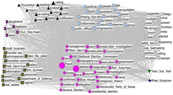 Table 2 shows the top 50 keywords among the major cited keywords on Twitter related to the term election fraud in South Korea. The top 10 keywords in terms of frequency were election, fraud, voting, Jaemyung Lee, NEC, Suk-yeol Yoon, Bupyeong City, presidential election, vote, and Daegu, in that order. Similarly, the central words election and fraud appeared most frequently, followed by NEC, which was the term associated with early voting and the keyword that led to the emergence of revoting arguments.
