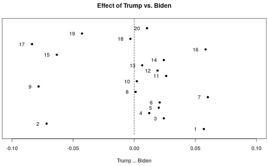 Figure 4 compares the effects of the candidates Trump and Biden in all topics. The study found more topics for Biden than for Trump, but those related to Trump were more distant than those associated with Biden. Topics 1, 7, and 16 were unique to Biden. Trump supporters blamed Biden for what they were led to believe was election fraud, and Biden supporters criticized Trump’s accusations. Topics 2, 9, and 17 were unique to Trump. Similar to the topics related to Biden, these included actions caused by Trump and reactions from Biden supporters. Trump’s supporters believed his false accusations, refused to accept the election results, and mentioned extreme measures, such as a coup. Meanwhile, Biden’s supporters were aware that Trump’s accusation of election fraud was false because of the lack of legitimate evidence.
