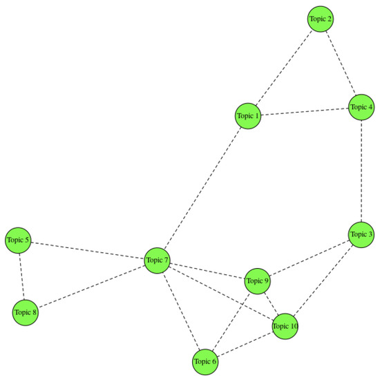 According to Figure 5, all topics are correlated with one another. Topic 7 shows five connections, and topics 9 and 10 display four connections. Topic 7 includes an investigation into potential election fraud, which has many targets, such as President Moon, candidate Yoon, related individuals, and the media. Topics 9 and 10 refer to election fraud methods; each political ideology group has their own perspective on how election fraud is committed, such as through ballot manipulation and the immobilization of voters in the context of COVID-19. Topics 5 and 8 are separate from other topics because they represent criticisms of candidate Yoon and his election promise, that is, the relocation of his office to the Ministry of Defense. The words used in these two topics are not observed in others, except in topic 7.
