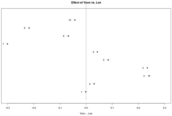 Figure 6 illustrates the effect between the two candidates. Topic 7, “requesting investigation”, is unique to the candidate Yoon. People who demanded an inquiry into election fraud mainly came from a progressive group that targeted Yoon. Topic 3, “conservatives calling out figures associated with election fraud”, mainly includes progressive politicians. Each group blamed the candidate of the opposite party; therefore, topics emerged for both candidates.