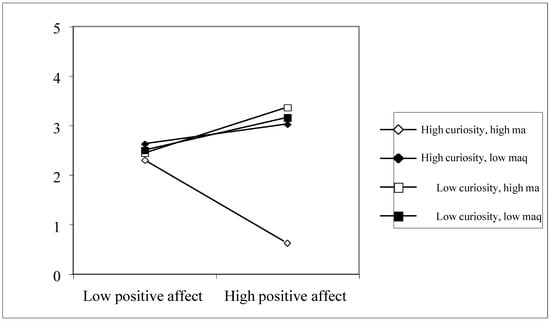 The three-way interaction between positive affect, curiosity, and Machiavellianism predicting COVID-19 stress. Note: Maq: Machiavelianism.