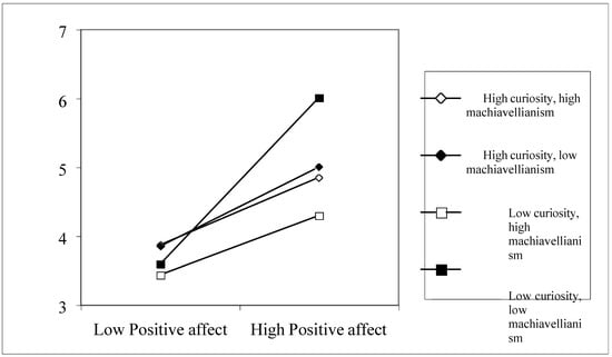 Based on the moderated mediation procedures suggested by  (), we looked at the slopes, and we found that the indirect effect of daily uplifts on COVID-19 stress via positive affect was only significant for high levels of both curiosity and Machiavellianism (B = −0.12, CI 95% [−0.23, −0.03]). That is, COVID-19 stress decreased when positive affect increased for individuals who scored higher on the curiosity and Machiavellianism scales (Figure 2). Thus, the results, even though they support h3a, demonstrated a different pattern than what was expected.