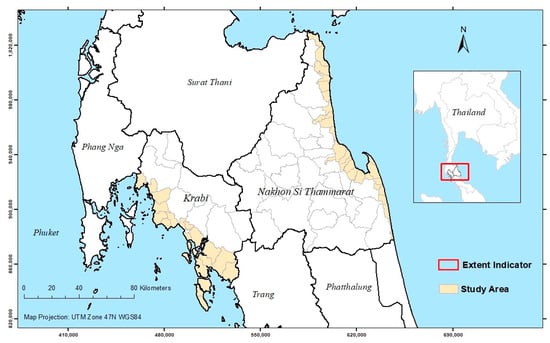 The study area encompasses 26 coastal sub-districts within 6 districts of NST and 20 coastal sub-districts within 5 districts of Krabi, situated in the southern region of Thailand, as depicted in Figure 2. NST is situated along the eastern coast, adjacent to the Gulf of Thailand, and its economy is primarily based on fisheries and aquaculture. The coastal stretch of NST spans approximately 225 km. In contrast, Krabi represents the western coast, adjacent to the Andaman Sea, and its economy relies heavily on tourism. The coastal line of Krabi extends for approximately 160 km. The spatial unit of analysis in both provinces is at the sub-district level. To analyze certain factors such as slope, house density, and land cover, it is necessary to use spatial units in the form of polygons. In the context of GIS data in Thailand, the smallest available administrative unit represented as polygons is the sub-district, while villages are depicted as points.