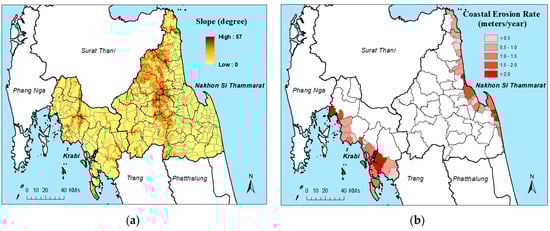 Slope: Digital Elevation Models (DEMs) were obtained from the Shuttle Radar Topography Mission (SRTM) DEM dataset featuring a spatial resolution of 90 m with a vertical accuracy of 10 m. These datasets were made available by the U.S. Geological Survey (USGS) and NASA. Subsequently, Geographic Information System (GIS) tools were employed to process these DEMs in order to derive slope data for the study area. Notably, the region in NST is characterized by a mountainous terrain oriented in a North–South direction, resulting in the formation of steep slopes in this area. In contrast, the topography of Krabi generally exhibits less pronounced slopes. To obtain representative slope values for each sub-district, the zonal statistics function in GIS was utilized to calculate the average pixel values within each sub-district.