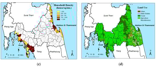Household Density: The household density in the study area varies, ranging from fewer than 250 houses per square kilometer to more than 1000 houses per square kilometer, as depicted in Figure 3c. The majority of sub-districts in NST have a density of less than 1000 houses per square kilometer. In contrast, most of the sub-districts in Krabi exhibit a density of more than 1000 houses per square kilometer.