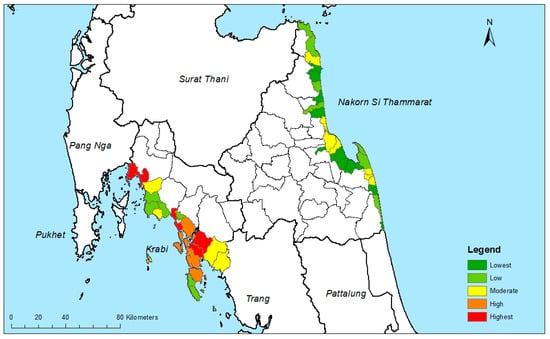 The Physical Vulnerability Index map in Figure 4 shows that the coastal regions in NST have lower vulnerability compared to Krabi. This difference arises from multiple factors contributing to lower vulnerability scores in NST, including reduced wave height, lower tides, decreased coastal erosion rates, lower household density, and predominant agricultural land use. In contrast, Krabi’s coastal areas, with higher household density and a greater proportion of urban land use, exhibit higher vulnerability levels.