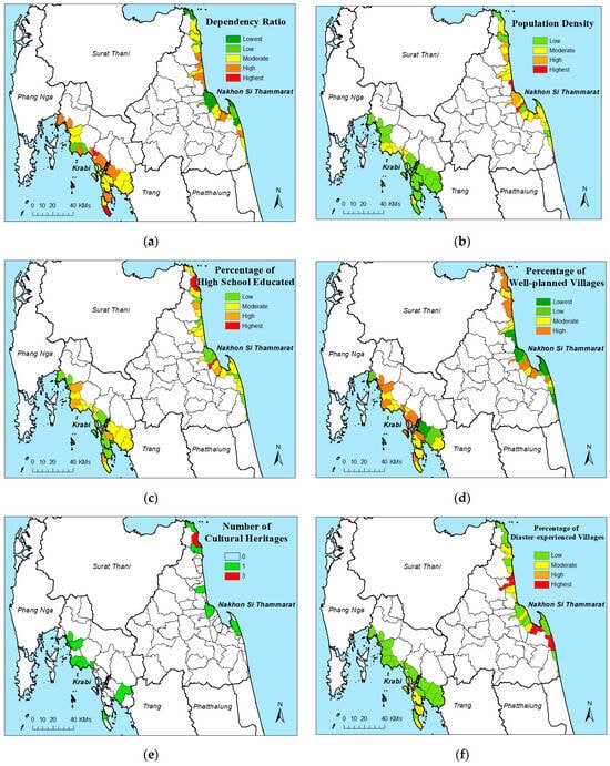 Figure 5 and Figure 6 depict the vulnerability levels of socio-economic factors. Notably, in NST, sub-districts showed higher vulnerability levels than Krabi in several socio-economic aspects, including dependency ratio, population density, villages with a history of natural disasters, poverty rates, number of farming households, and number of fishery households. However, the distribution patterns of the remaining factors appear more varied and do not consistently favor one province over the other.