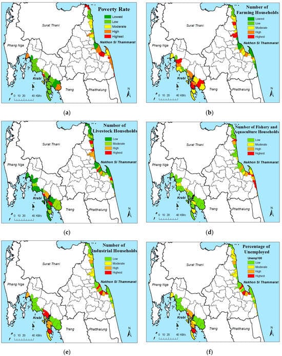 Economic factors for generating a socio-economic vulnerability index map: (a) poverty rate (b) number of farming households; (c) number of livestock households; (d) number of fishery and aquaculture households; (e) number of small industrial households; (f) percentage of unemployed people.