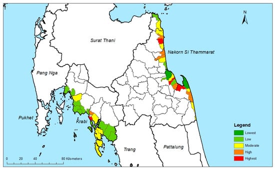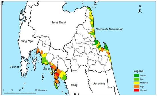 In Figure 7, it is evident that sub-districts along the coastlines of NST generally exhibited higher socio-economic vulnerability compared to those along the coastline of Krabi. Within Krabi Province, the southern coastal areas were more vulnerable than the northern coastal areas. Conversely, within NST, almost all sub-districts along the coast are classified as having high vulnerability, with the exception of the northern part of the province, which demonstrates lower vulnerability levels.