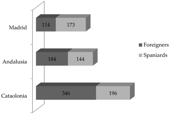 According to the census, we found in Madrid a total of 118,740 foreign Muslims and 180,571 Spaniards; in Catalonia, 359,883 foreigners and 204,172 Spaniards; and in Andalusia, 191,391 foreigners and 149,678 Spaniards. Proportionality was maintained in the selection of participants for inclusion in the final sample. Thus, the final sample shown in Figure 1 was obtained.