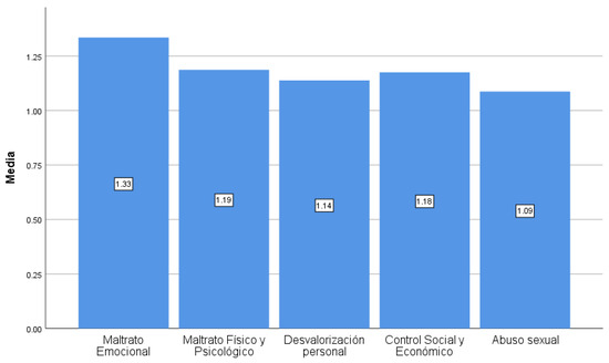 We begin this section by describing, based on a general analysis, the data on violence in the participants’ relationships. The results (Figure 1) offer us information on the arithmetic means obtained in the dimensions related to the different types of violence analysed regarding victimisation and show us that the highest means correspond to emotional abuse (M = 1.33), followed by physical and psychological abuse (M = 1.19) and social and economic control (M = 1.18). The type of violence least suffered by our participants was sexual abuse (M = 1.09), closely followed by personal devaluation (M = 1.14).