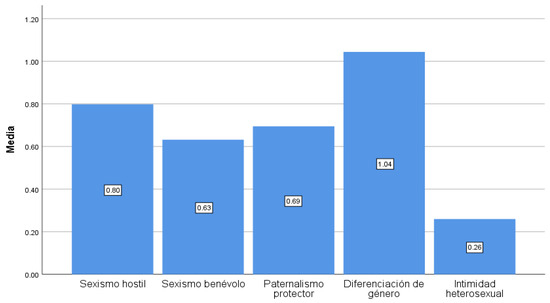 Concerning the internalisation of sexism among the participants, it can be affirmed that the sample had low levels of ambivalent sexism. However, highest results were observed in the gender differentiation subdimension (M = 1.04), followed by protective paternalism (M = 0.69) (Figure 2).