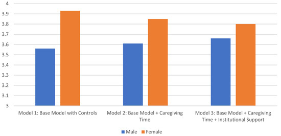 One of the major themes emerging in Table 2 is that female respondents experienced higher caregiving demands and stress, and less institutional support, than their male counterparts. Moreover, individuals with greater caregiving demands experienced higher levels of stress and lower levels of institutional support. In Table 3, we investigate the extent to which gendered patterns of time use and institutional support might be able to help explain the higher levels of stress that female respondents reported.