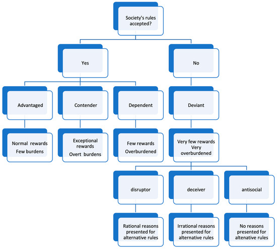 Regarding the 1993 social construction theory, it has here been depicted hierarchically whether or not the rules of society are accepted by its members and the power levels in relation to this. In the power hierarchy, revealed in Figure 1, the first level concerns the power of decision-making regarding society’s rules. The fact of making a decision, whether “yes” or “no”, demonstrates equal power in either response. Next is the type of decision made concerning the 1993 social construction theory. As each construction defined by the theory is equal in the types of variables considered, the power as a social construction is equal. The level below concerns the rewards and burdens associated with these social constructions. Since each construction has both burdens and rewards in either accepting or rejecting society’s rules, the power of the representative variables in this regard is equal. However, Deviants can be divided into several other categories concerning how they respond to rules in their interest and their ability to convince others that society’s rules should be changed. This way of interpreting Deviants is not part of the Schneider and Ingram social construction theory. Instead, it is informed by Cohen’s theory on delinquent boys (Cohen 2016). Although developed in 1955, this theory continues its relevance today (Holt 2020; Iuliana 2021; Rahman 2022). It is a theory of delinquency particularly relevant to the 1993 social construction theory in considering the origins of deviance related to the subculture assessment of middle-class rules (Cohen 2016).